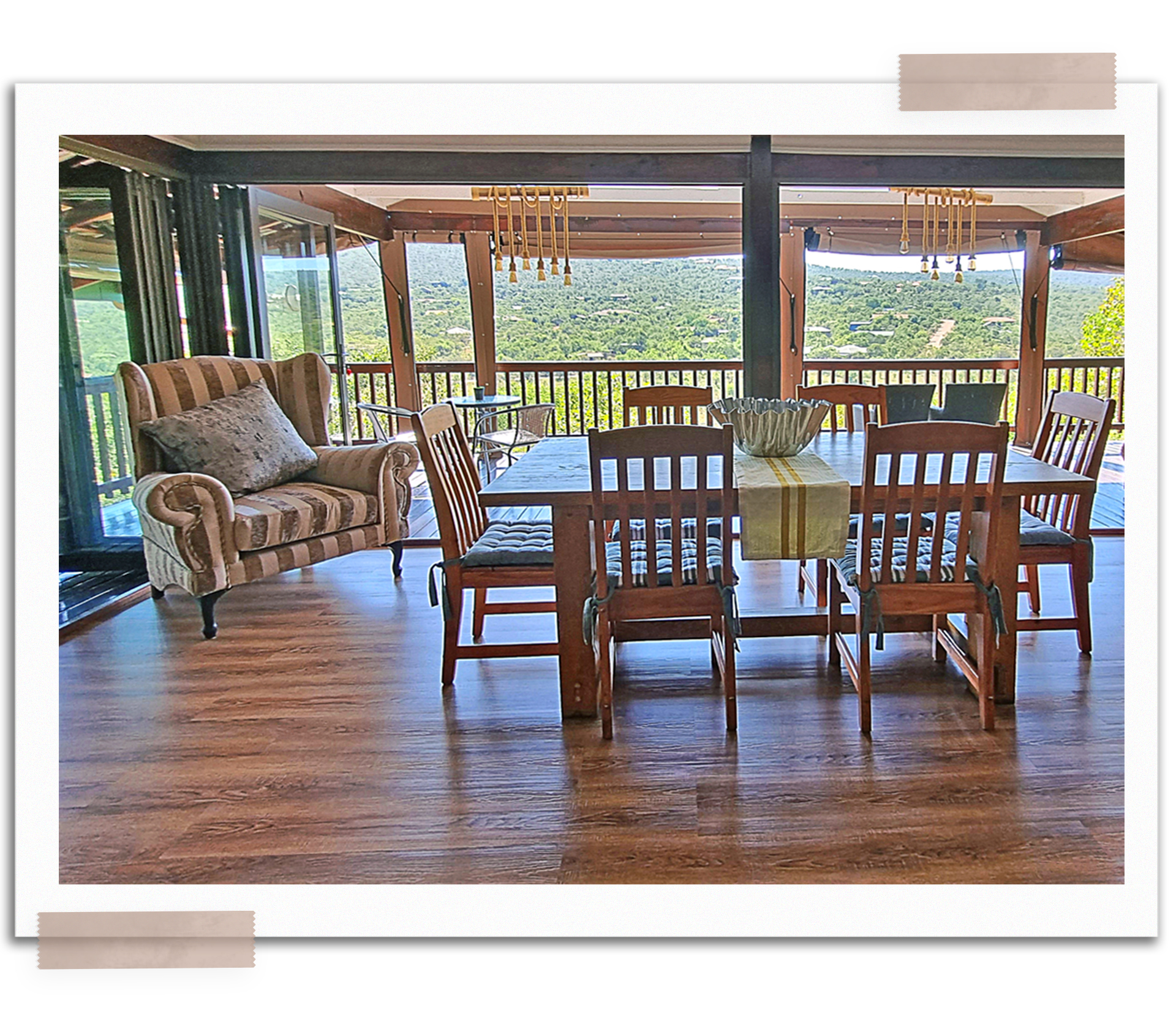 The patio at Loskop Serene is a spacious and beautiful outdoor area. It has a large dining table where guests can enjoy meals surrounded by nature. There are also cozy wingback chairs for relaxation and contemplation. A minibar offers a variety of beverages for guests to enjoy. The patio also has small tables for a more intimate setting to enjoy a drink. With its comfortable seating, stunning view, and thoughtful amenities, the patio provides a wonderful outdoor oasis for guests to relax and create lasting memories.