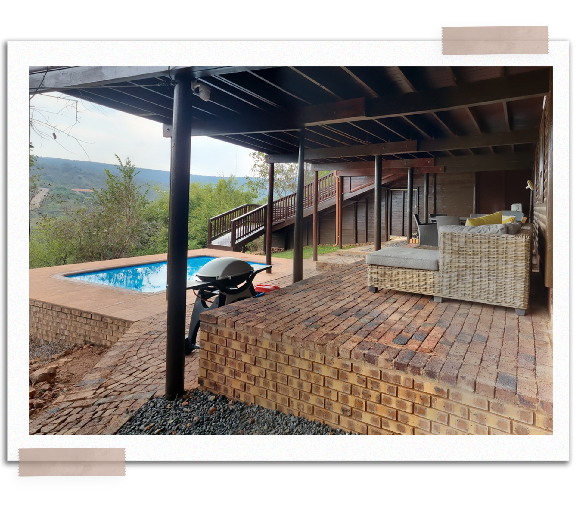 The patio by the swimming pool at Loskop Serene is a luxurious outdoor space. It has a cozy L-shape couch with plush pillows for relaxation. There is also a spacious dining table and chairs for outdoor meals. The patio is equipped with a gas braai for grilling delicious food. It offers a mix of comfort, style, and functionality, allowing you to lounge, dine, and enjoy a braai by the poolside. Immerse yourself in the refreshing atmosphere and peaceful surroundings of this inviting outdoor haven.